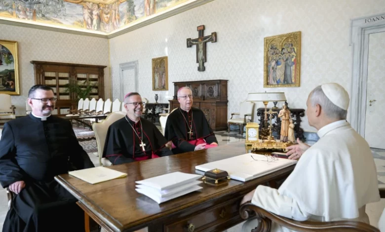 Pope Leo XIV receives Bishop Pierre Goudreault of Sainte-Anne-de-la-Pocatière, president of the Canadian Conference of Catholic Bishops (center), Archbishop Richard Smith of Vancouver (right), and Father Jean Vézina, secretary-general of the Canadian bishops (left), in a Nov. 15, 2025, meeting at which the Holy Father gifted dozens of artifacts that originated with Indigenous peoples of the North American country. Leo at the meeting donated 62 pieces from the ethnological collections of the Vatican Museums to the Canadian bishops. / Credit: Vatican Media Montreal, Canada, Dec 8, 2025 / 14:48 pm (CNA).
