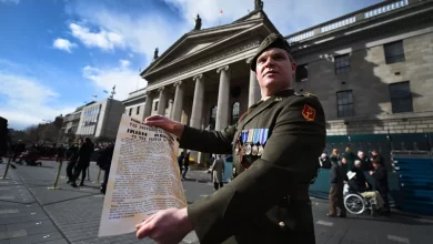 An Irish soldier holds the a copy of the 1916 Proclamation of the Irish Republic outside the General Post Office,…